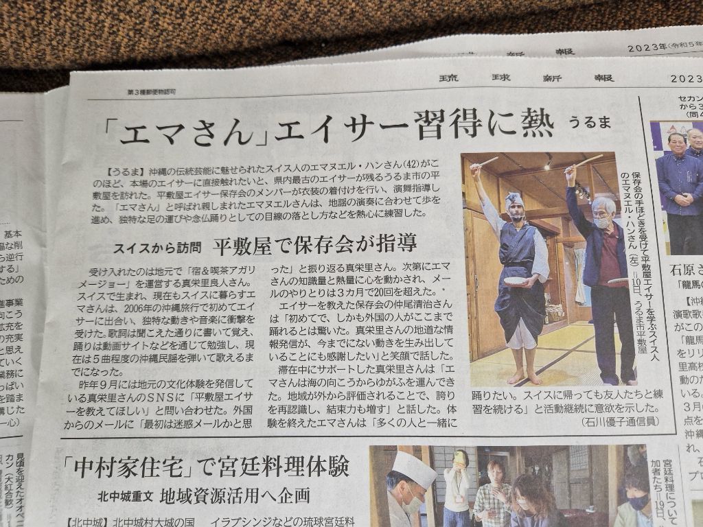 Ryukyu Shimpo writes about me learning Heshikiya Eisa