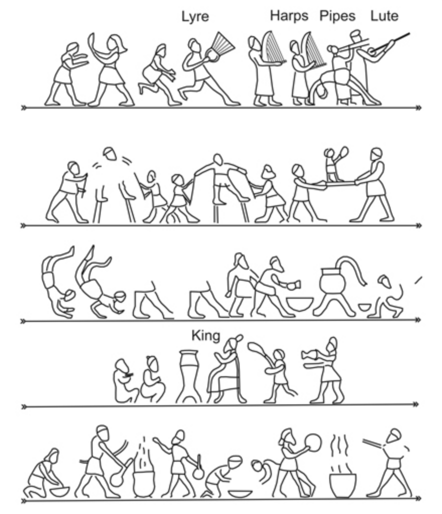 A large pictorial bowl of 43.5 cm diameter was found at Arjan in western Iran which portrays royal activities. It is dated to the last period of the Elamite kingdom (620–580 B.C.E). Secular activities are shown in five concentric circles, and the fourth (see figure) is a scene of feasting with musical entertainment. The five segments of this circle are presented in a linear sequence. (Lawergren, 2001b, fig. 8) Source: Bo Lawergren, “MUSIC HISTORY i. Pre-Islamic Iran,” Encyclopædia Iranica, online edition, 2016, available at #^http://www.iranicaonline.org/articles/music-history-i-pre-islamic-iran (accessed on 19 May 2016).